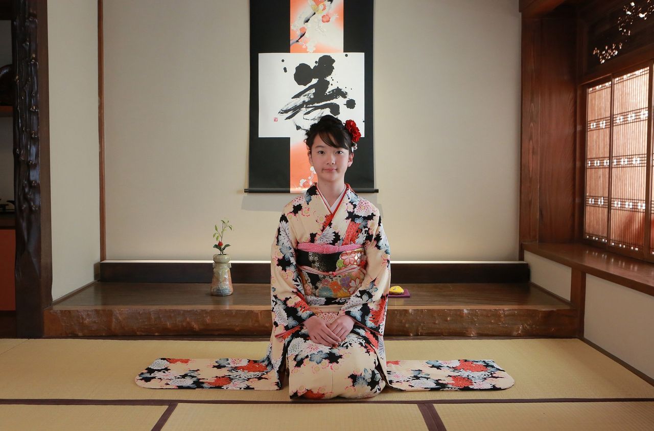 凛とした姿勢が美しい。優しいまなざしの振袖姿のお嬢さま。本日は十三参りのお祝い撮影でお越しくださいました。鎌倉着物スタジオ人気の和室での振袖撮影シーンです。