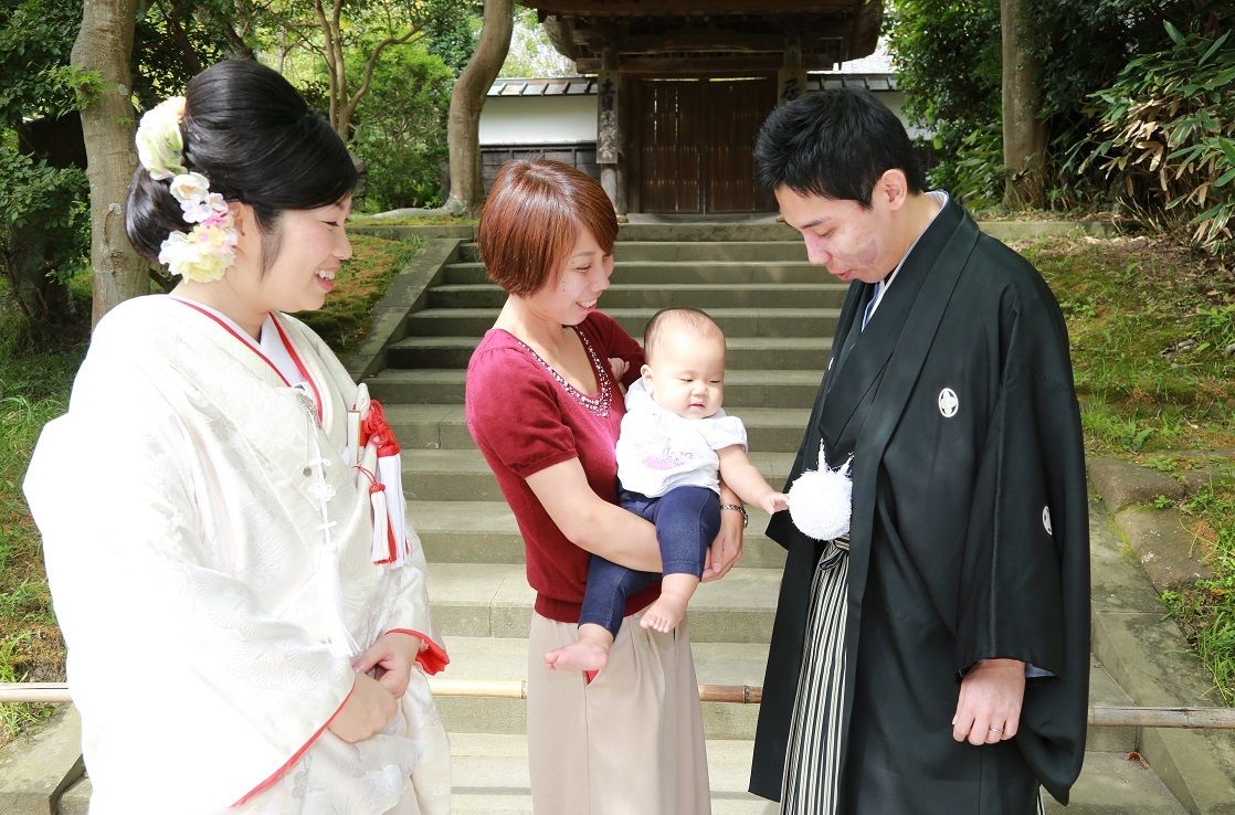 ご先祖様にご結婚報告をして、ご家族皆さまと撮影を楽しむスタイル。