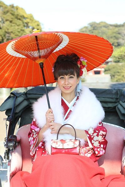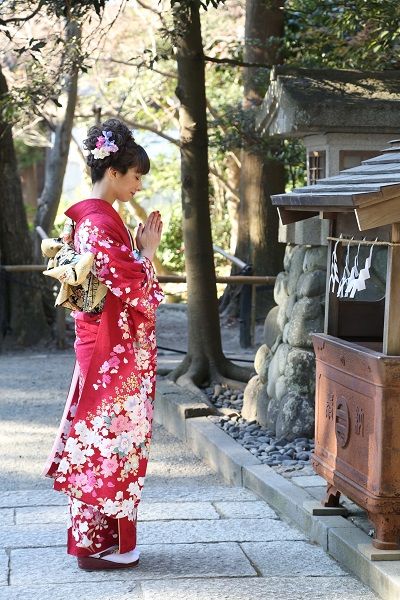 雨上がりの石畳。水分を含み鬱蒼とした社の奥の木々たち。鶴岡八幡宮 白幡神社の静謐な雰囲気が、振袖を纏い、美しい所作のお嬢様を一層引き立ててくれました。