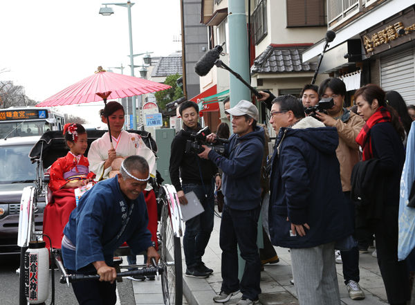そろそろ紅葉も見ごろの週末、7歳のお嬢様とお母さまが有風亭さんの人力車に乗る当店のローケション撮影中、何やら一群の人々が人力車を取り囲みました。よーく見るとその中心にTVの司会で有名な、あのキャスターさんが・・・。病気をされたと伺っていましたが、実に元気に復活されていて、お客さまへの気さくなインタビューが始まりました。