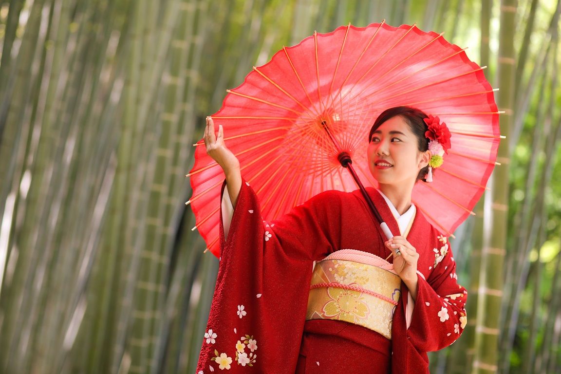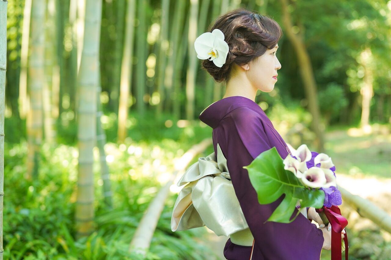 青々とした竹林を背景に。夏の成人式前撮りの1シーンです。涼やかな感じがとても素敵ですね。
