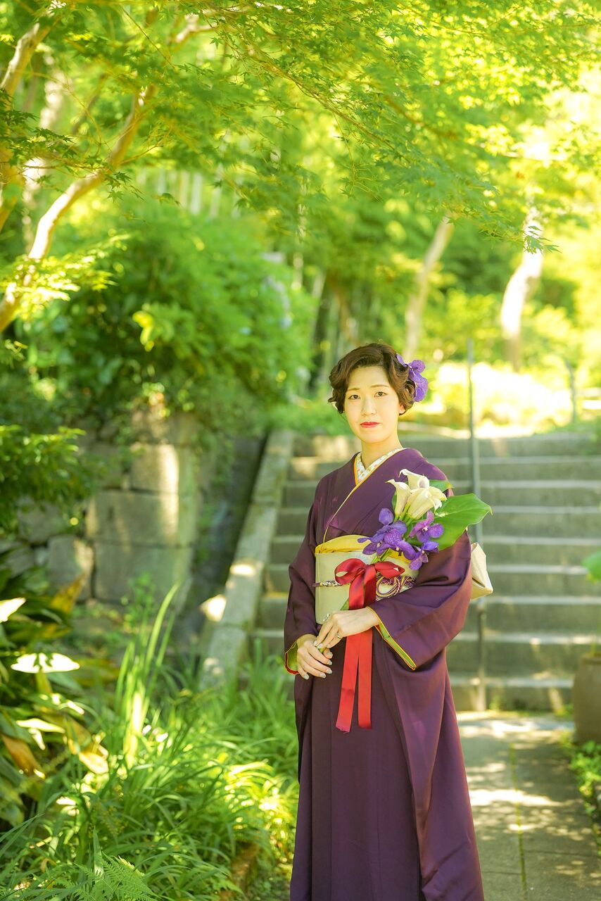 上質な紫の振袖とブーケ、2色の髪飾り。さすがのコーディネートです!