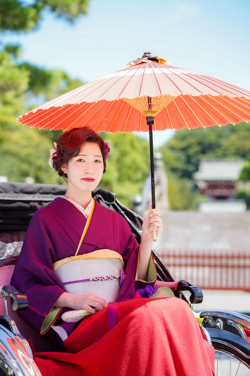 人力車での撮影。和傘で「日本の夏」を感じる一枚に