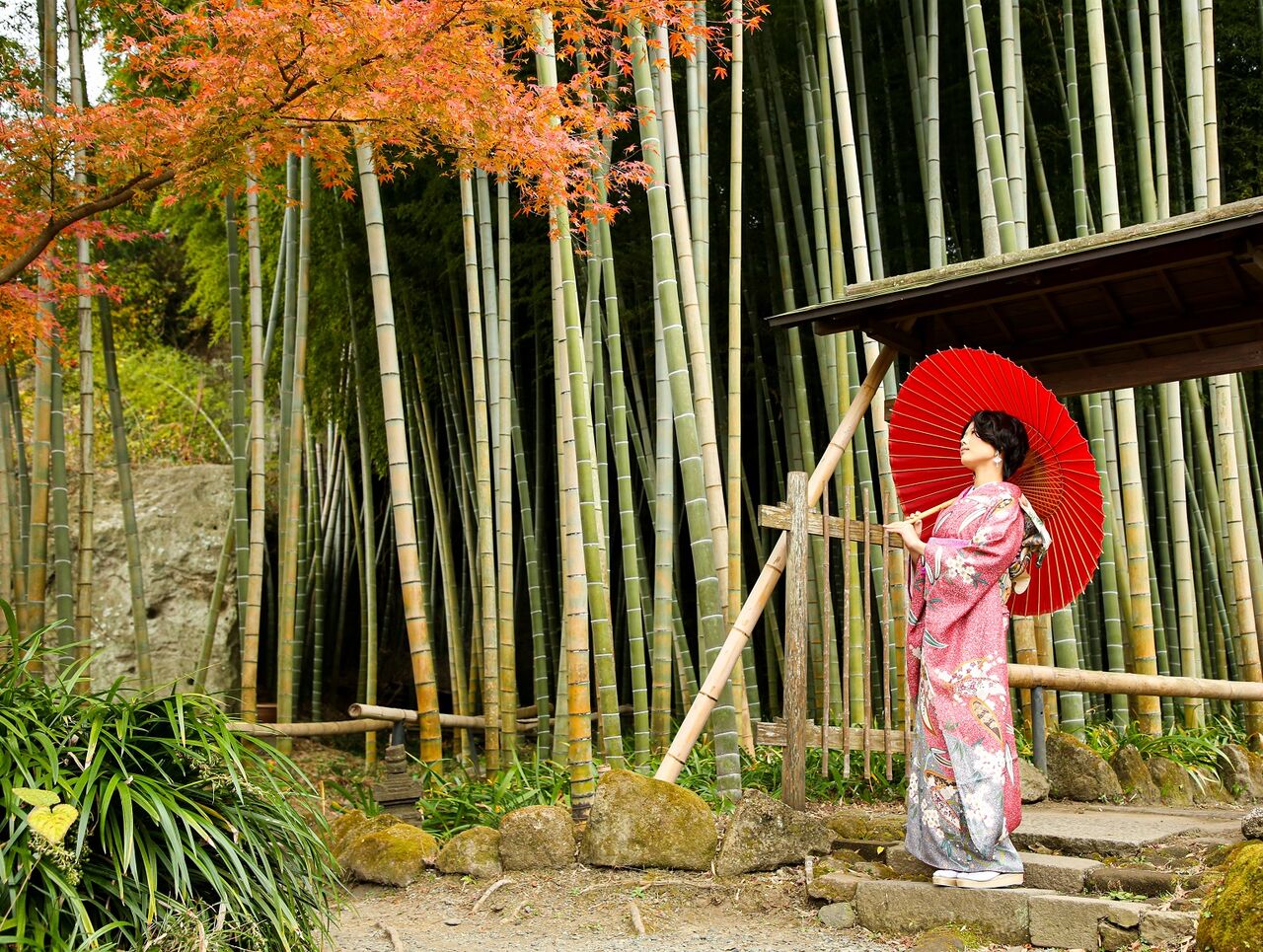 本日の撮影ルートは、若宮大路にある当店前から、有風亭人力車で鶴岡八幡宮三の鳥居へ。八幡さまを背景に撮影したのち、小町通りを経由して川喜多邸 黒板塀での撮影を楽しみ、竹林の美しい扇ガ谷の名刹へ行きました。