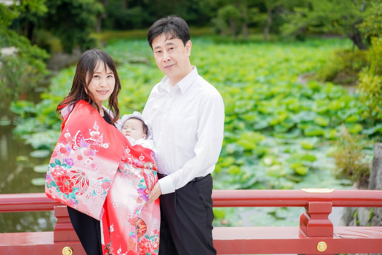 蓮のグリーンを背景にするのもいいですね。産着姿がとっても映えます。